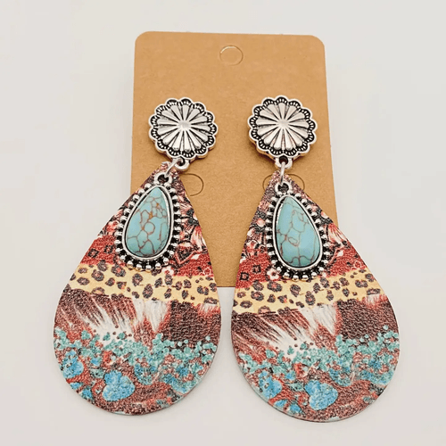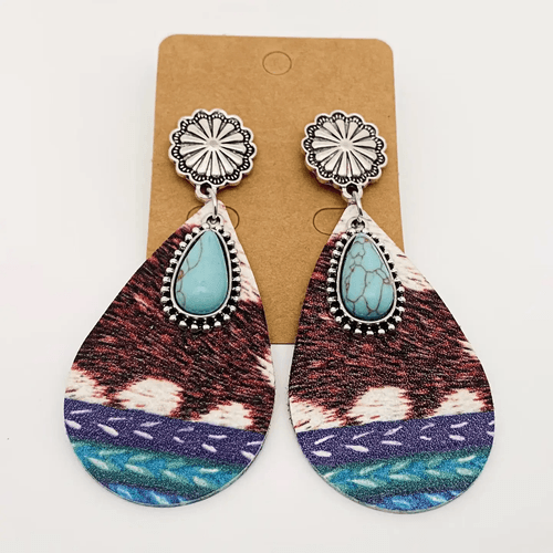 Western Drop-Shape Leather Turquoise Pendant Earrings - Wj