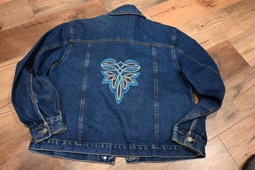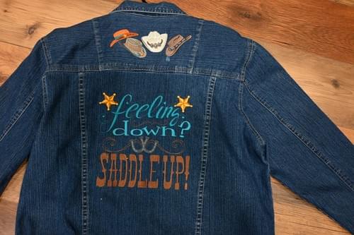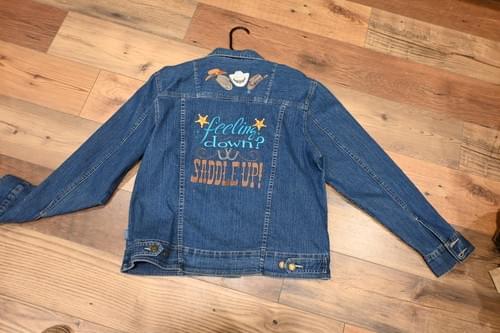 $85.00Custom embroidered refurbished denim jacket. It is a size medium and features the funnest "Saddle Up" design on the back with sheriff stars and cowboy hats. Definitely a favorite of mine!