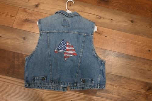 $55.00This is a one-of-a-kind Studio 25 refurbished denim vest in a size Large. On the front, we’ve got the "Ride with Pride" design in those classic red, white, and blue colors. It’s the perfect piece for your next trail ride or just showing off your western spirit!QuantityComing soon
