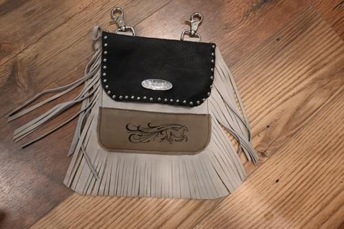 $75.00Saddle up and ride with confidence—our handmade leather hip bag is designed for riders who want style and practicality. Featuring Jill’s original design, this bag fits comfortably at your hip, keeping essentials like your phone and keys secure with a smooth magnetic closure. Each bag is custom made from quality leather, with the perfect blend of western flair and everyday functionality whether you’re out on the trail or at the barn. This one features a embroidered horse on light brown with a dark brown flap and some silver bling and magnetic snap closure. Crafted in the Arizona desert, it’s a piece that’s as unique as your ride! Approximately 7" X 7"QuantityComing soon