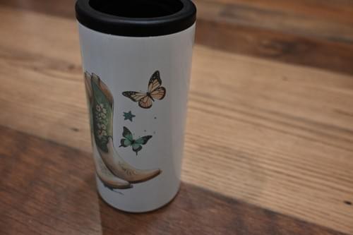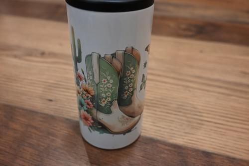 A pair of mint-green cowboy boots decked out in floral embroidery, surrounded by a vibrant bouquet of wildflowers and a classic saguaro. With those whimsical butterfly and star accents, it’s the perfect way to keep your drink ice-cold while bringing a little bit of that Arizona "Boots & Blooms" vibe to the ranch or the patio.