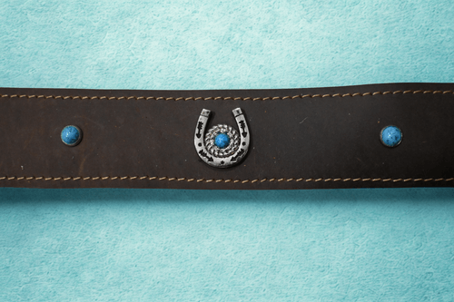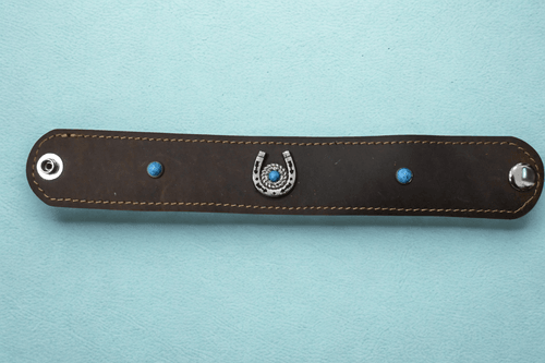 Dark brown leather bracelet with horsehoe with turquoise accets. Snap closure. Approximately 9" X 1 1/2"