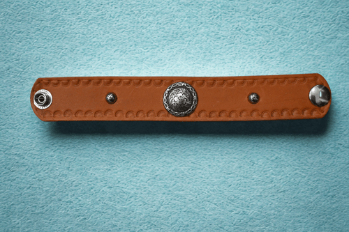 Hand stamped bracelet with silver rope and flower concho. Snap closure. Approximately 7" X 1 1/4"
