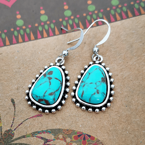 These silver plated turquoise drop earrings jewelry feature a vibrant turquoise stone set in a sleek dangle design. Lightweight and stylish, perfect for everyday wear or special occasions.