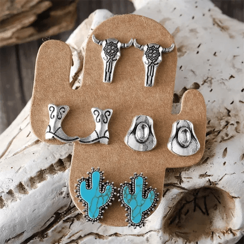 Set of 4 fun western themed turquoise color stone earrings. Perfect to wear with your line dancing outfit!