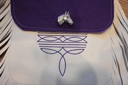 Saddle up and ride with confidence—our handmade leather hip bag is designed for riders who want style and practicality. Featuring Jill’s original design, this bag fits comfortably at your hip, keeping essentials like your phone and keys secure with a smooth magnetic closure. Each bag is custom made from quality leather, with the perfect blend of western flair and everyday functionality whether you’re out on the trail or at the barn. This one features a purple boot stitch on white with a purple flap with horse head magnetic snap closure. Crafted in the Arizona desert, it’s a piece that’s as unique as your ride! Approximately 7" X 7"